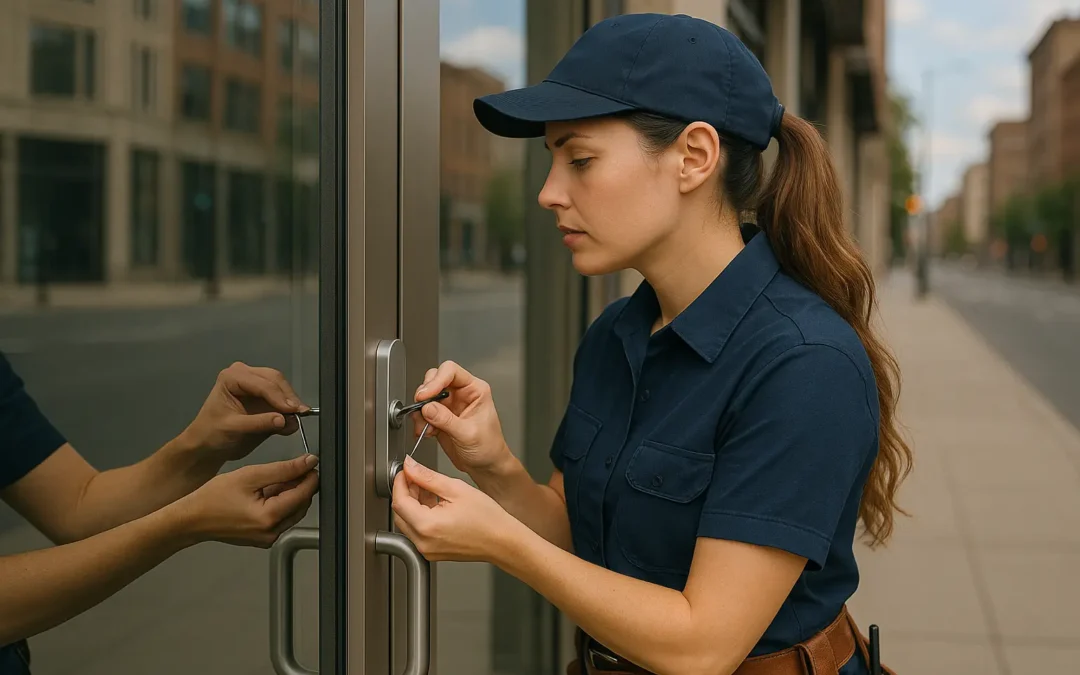 female-locksmith-unlocking-glass-door-urban-storefront by | Professional female locksmith unlocking a commercial glass door in an urban setting using precision tools.
